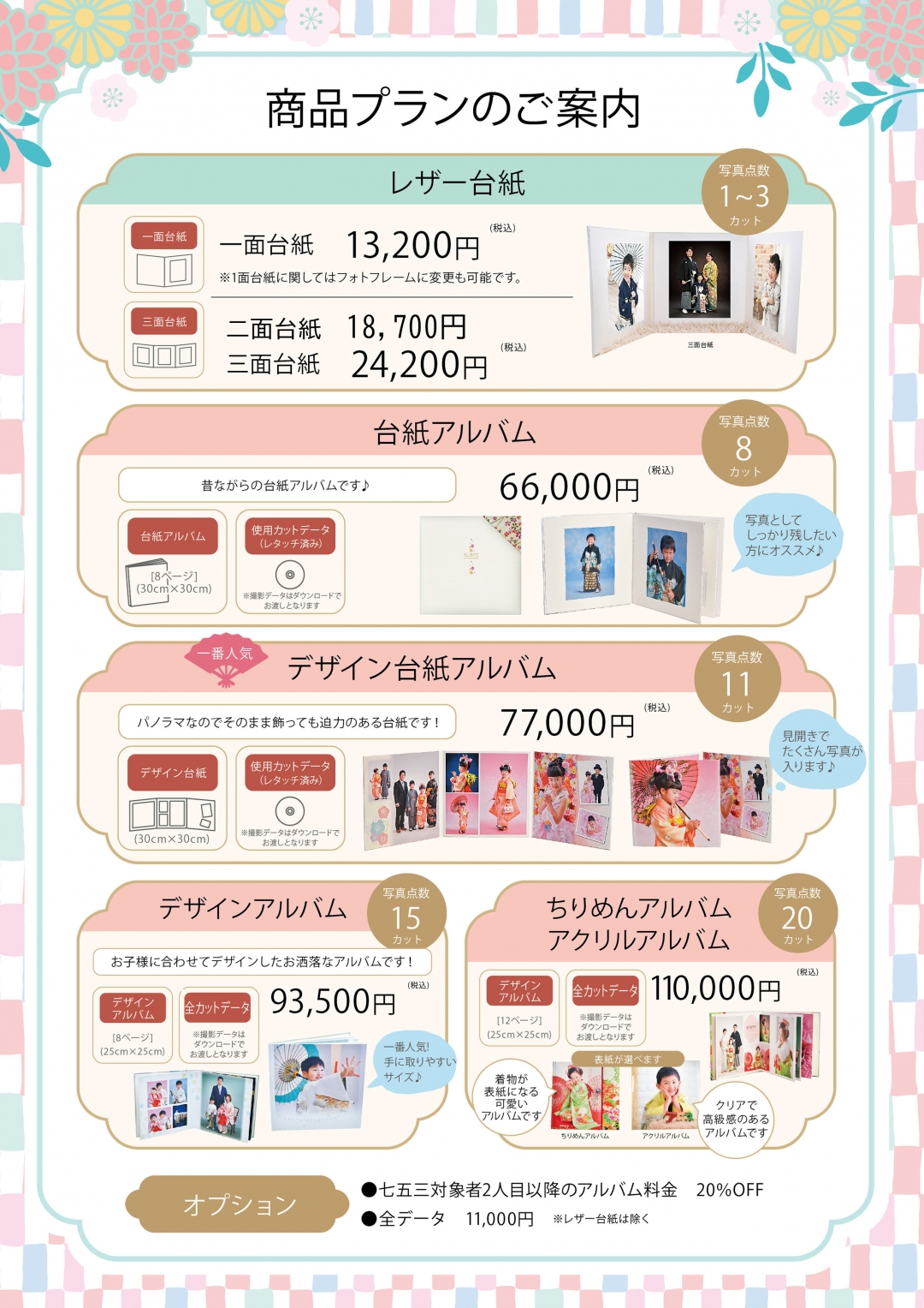 | 【商品プラン】 | 【商品プラン】 ◎レザー台紙 (着物1着での撮影) シンプルな写真台紙です。 1面台紙 13,200円 2面台紙 18,700円 3面台紙 24,200円 使用データ1カット+2,750円 洋装撮影+5,500円 ◎台紙アルバム66,000円 (8カットデータ付き) (着物1着と洋装1着で撮影) オーソドックスな写真台紙アルバムです。 全データ+11,000円 ポストカードプレゼント(6月まで) ◎デザイン台紙アルバム77,000円 (11カットデータ付き) (着物1着と洋装1着で撮影) 見開きでたくさん写真が入ります。 全データ+11,000円 ポストカードプレゼント(6月まで) ◎デザインアルバム93,500円 (全データ付き) (着物1着と洋装1着で撮影) デザインしたお洒落なアルバムです。 ポストカードプレゼント(6月まで) ◎ちりめんアルバム110,000円 (全データ付き) (着物1着と洋装1着で撮影) 着物が表紙になるカワイイアルバムです。 ポストカードプレゼント(6月まで) ◎アクリルアルバム110,000円 (全データ付き) (着物1着と洋装1着で撮影) クリアで高級感のあるアルバムです。 ポストカードプレゼント(6月まで) ※主役2名以上の場合 一つのプランで撮影または それぞれ別のプランでの撮影が可能です。 |