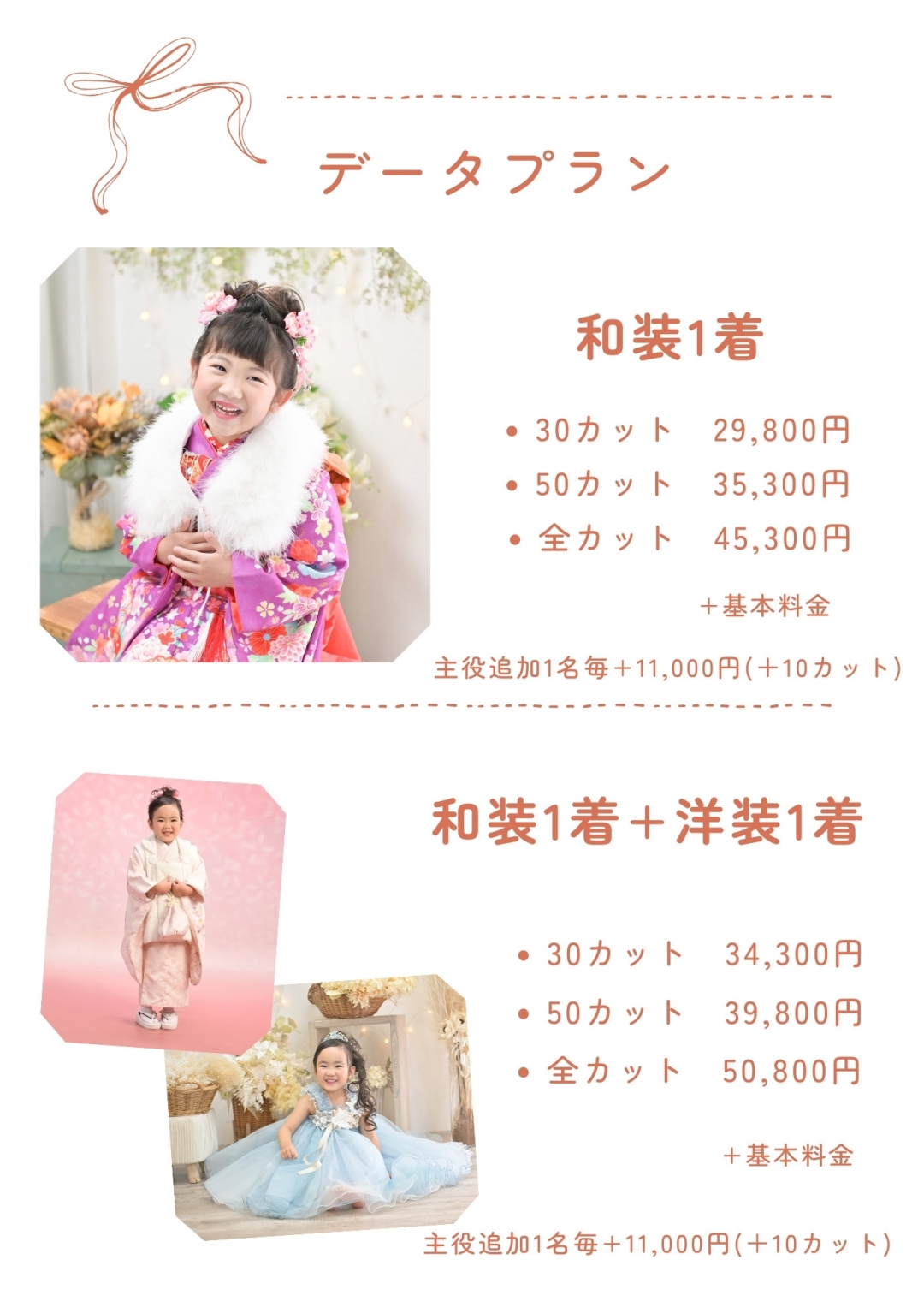 | 【データプラン】 | 【データプラン】 ◎着物1着 30カット 29,800円 50カット 35,300円 全カット 45,300円 全カットプランはポストカードプレゼント(6月まで) ◎着物1着と洋装1着 30カット 34,300円 50カット 39,800円 全カット 50,800円 全カットプランはポストカードプレゼント(6月まで) 主役1人追加毎に+11,000円 (+10カット) データはダウンロードお渡しです。 |