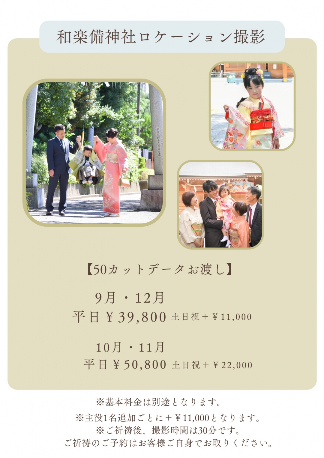 | 【ロケーションプラン】 | 【和樂備神社ロケーションプラン】 ◎9月・12月 平日39,800円 土日祝+11,000円 ◎10月・11月 平日50,800円 土日祝+22,000円 主役1人追加毎に+11,000円 50カットデータのお渡しです。 撮影場所は和樂備神社です。 (スタジオから車で10分) 【注意事項】 ・お着物1着の撮影となります。 ・ご祈祷後の撮影となります。 (撮影時間は30分程です) ・ご祈祷のご予約はお客様自身でお願いいたします。 ご祈祷については和樂備神社ホームページをご覧ください。 ・データはダウンロードお渡しです。 お客様の状況によってはカット数に満たない場合もございます。 |