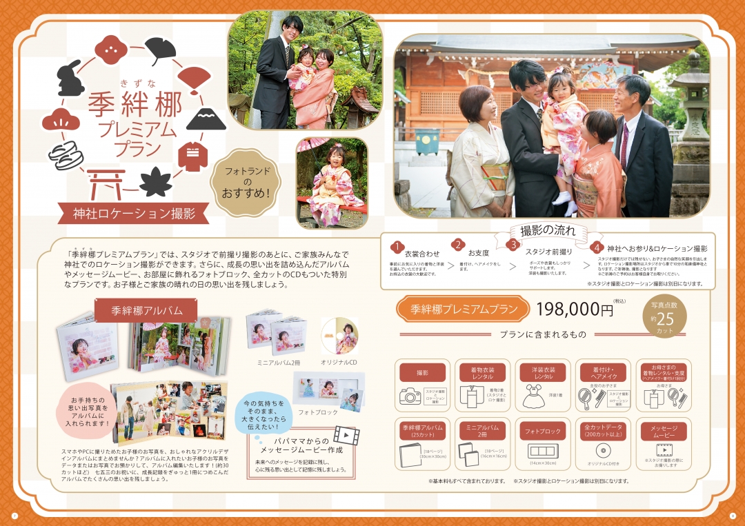 | 【季絆梛-キズナ-プラン】 | 【季絆梛-キズナ-プラン】 こちらのプランは 基本料金も含まれております。 スマホやPCに撮りためたお子様のお写真をおまとめできる「キズナアルバム」プランです。 七五三までのお子様の成長記録を1冊にできる特別なプランです。 ◎キズナプレミアム198,000円 キズナアルバムと全データ ・スタジオとロケーション撮影 ・ママの着付けヘアメイク付き ・ミニアルバム・フォトブロック付き ・パパとママからお子様へのメッセージムービー ◎キズナライト130,000円 キズナアルバムと全データ ロケーションかスタジオ撮影どちらかお選びできます。 |