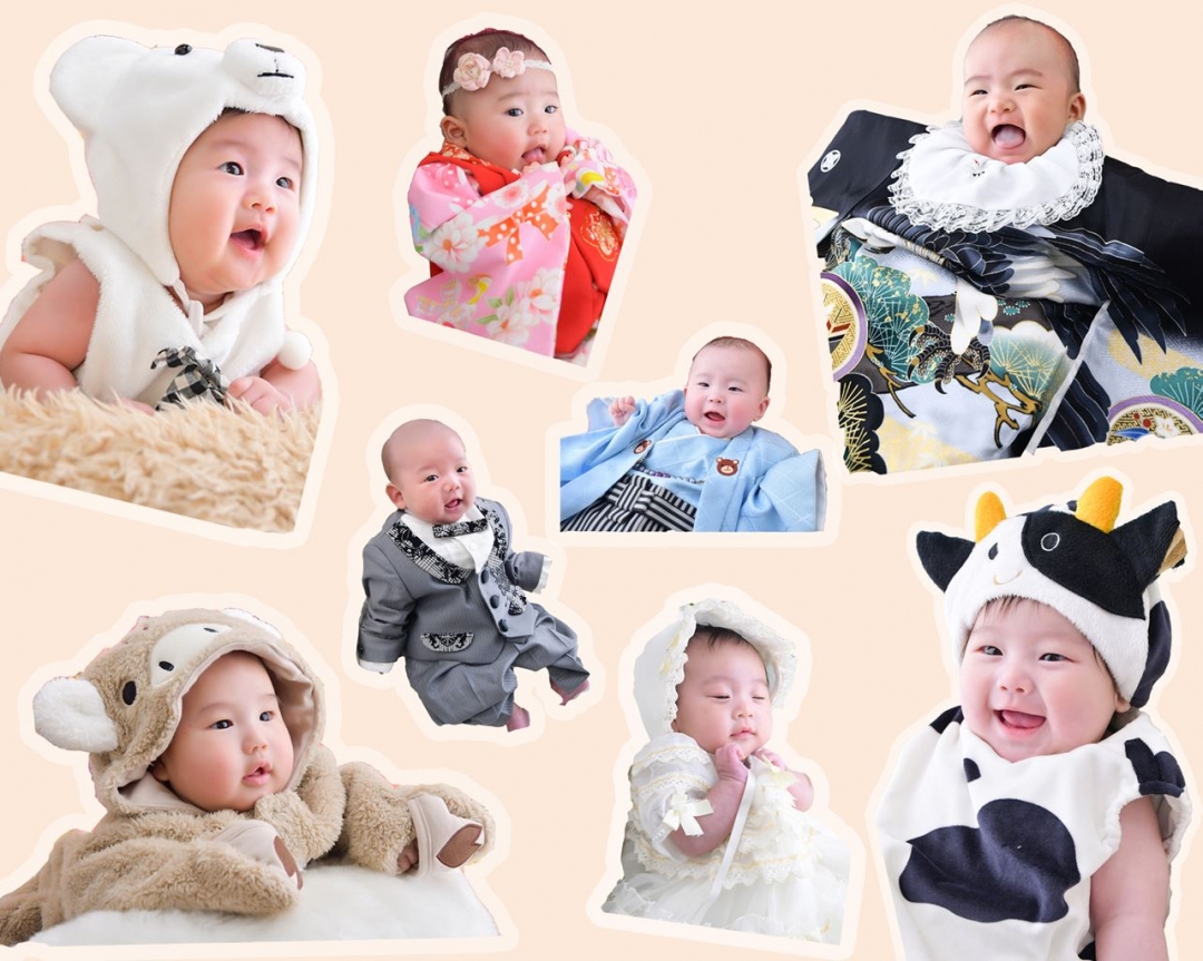 ①赤ちゃん撮影時、無料で衣装レンタルできます。(祝い着・着物・洋装・ベビードレス・着ぐるみ)
