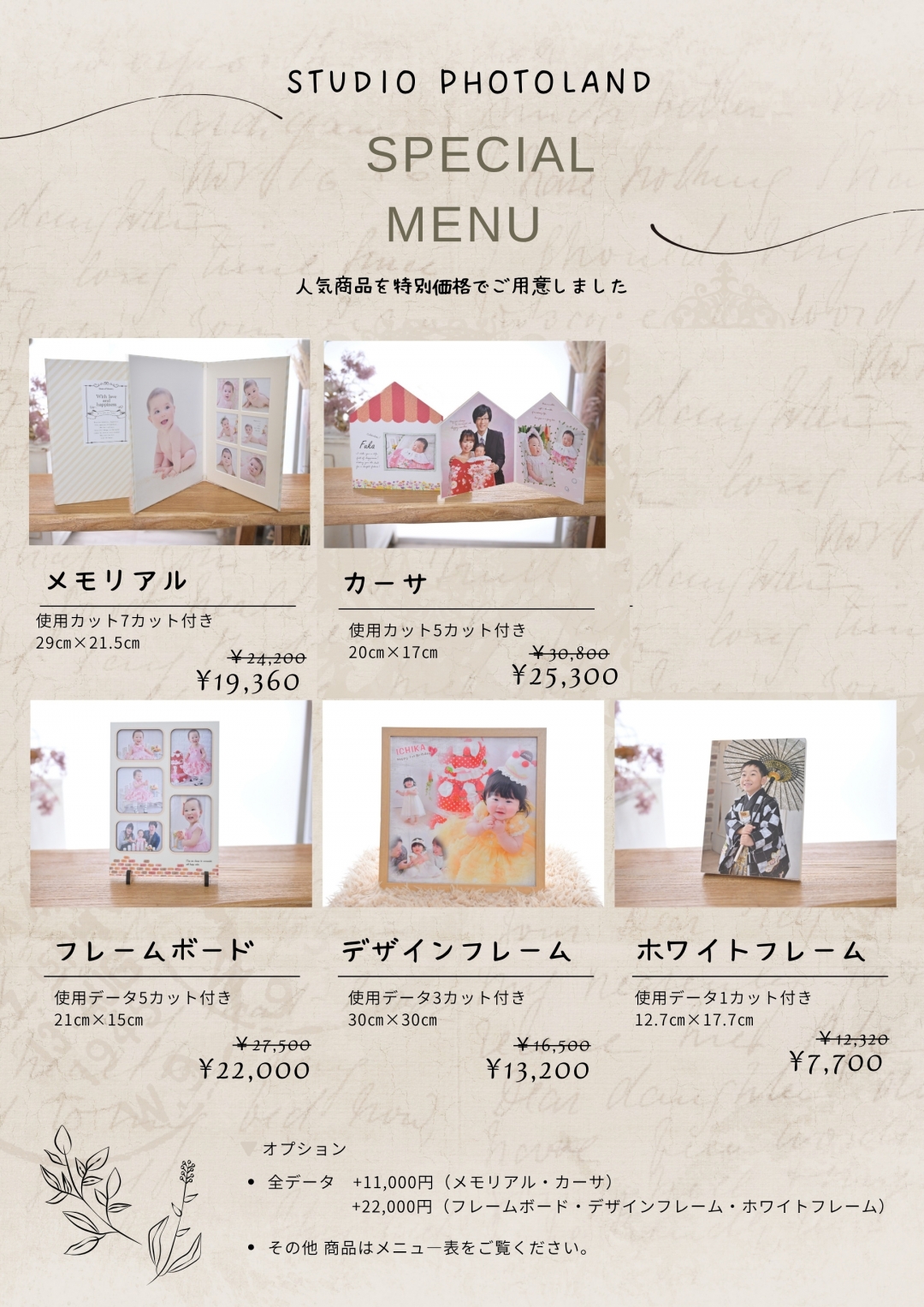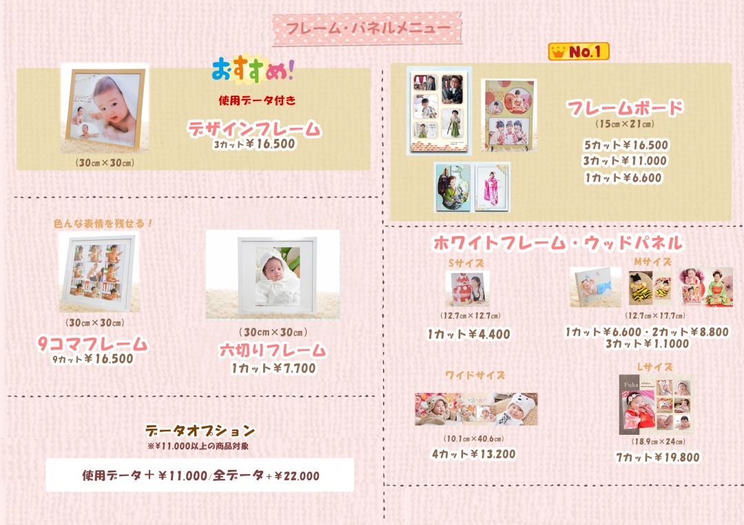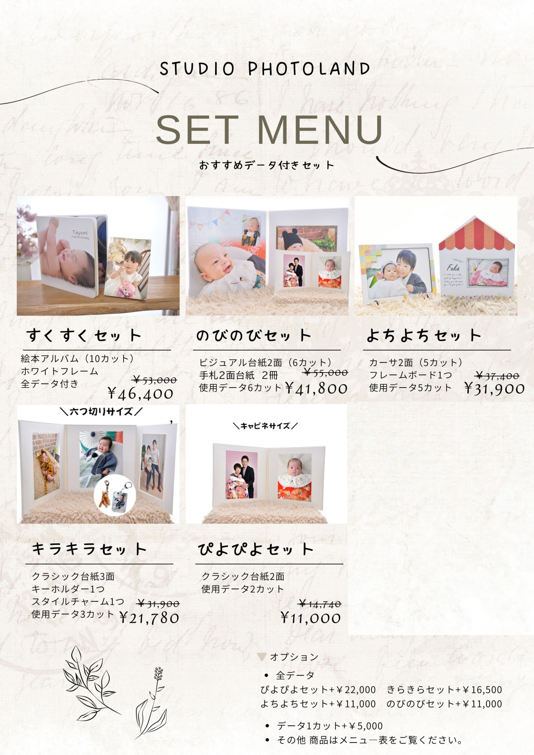 | セットメニュー① | ・すくすくセット (セット内容) 絵本アルバム1冊 ホワイトフレーム1つ 全データ 通常53,000⇒¥46,400 ・のびのびセット (セット内容) ビジュアル台紙2面1冊 手札台紙2面2冊 6カットデータ 通常55,000⇒¥41,800 ・よちよちセット (セット内容) カーサ2面1冊 フレームボード1つ 5カットデータ 通常37,400⇒¥31,900 ・キラキラセット (セット内容) クラシック台紙3面(六切) キーホルダー1つ スタイルチャーム1つ 3カットデータ 通常31,900⇒¥21,780 ・ぴよぴよセット (セット内容) クラシック台紙2面(キャビネ) 2カットデータ 通常14,740⇒¥11,000 |