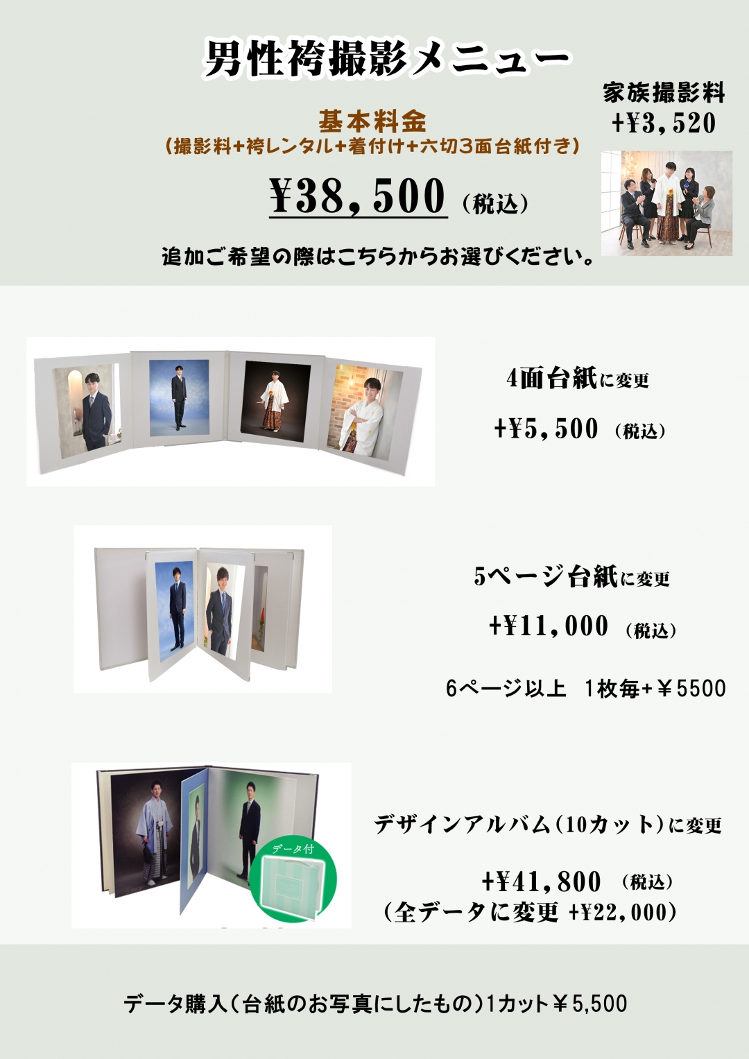 袴撮影プラン | 袴撮影プラン 【基本料金】 撮影料・袴レンタル 着付け代・六切3面台紙 38,500円 →平日撮影で10%OFF(12月まで) ■デザインアルバム(10カットデータ付き) 80,300円 袴だけでなくスーツの撮影も追加料金なしで同時にできます。 ※スーツのレンタルはございませんのでご自身でご用意ください。 【オプション】 ・1面追加毎+5,500円 ・データ1カット+5,500円 (台紙のお写真にしたもの) ・全データ+22,000円 (デザインアルバムのみ対象) ・家族撮影+3,520円 |