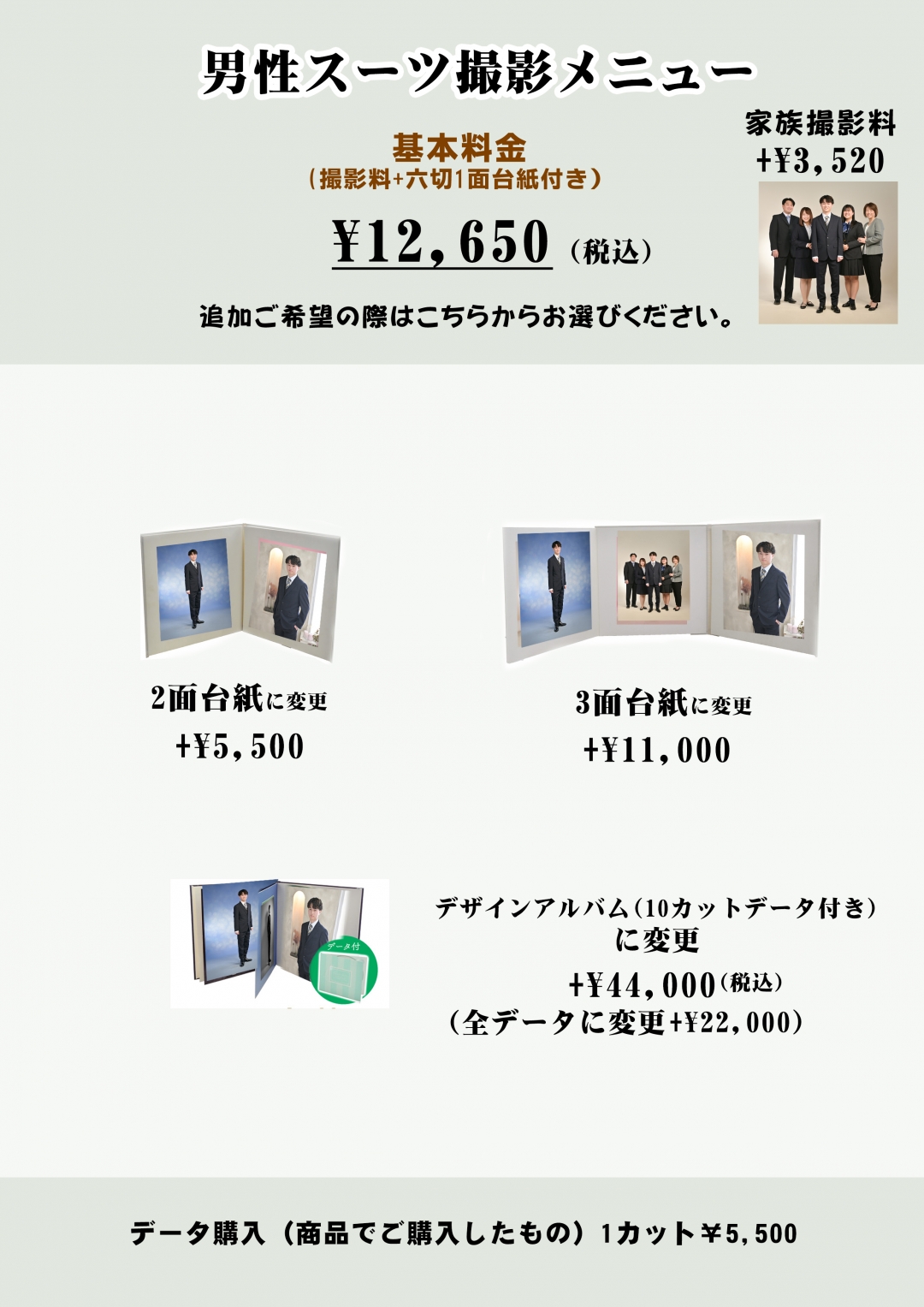 | スーツ撮影プラン | スーツ撮影プラン 【基本料金】 撮影料+六切1面台紙 12,650円 ■3面台紙 23,650円 ■デザインアルバム(10カットデータ付き) 56,650円 【オプション】 ・データ1カット+5,500円 (商品としてご購入したもの) ・全データ+22,000円 (デザインアルバムのみ対象) ・家族撮影+3,520円 ※スーツのレンタルはございませんのでご自身でご用意ください。 |