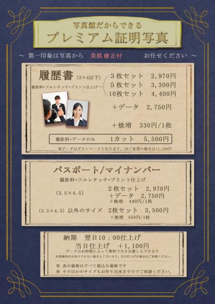 季節の行事 七五三 成人式 入学・卒業 桃・端午の節句 卒業袴 キッズ ニューボーン お宮参り・百日記念 お誕生日 1/2成人式・十三祝い はだかんぼ 1歳記念 ファミリー マタニティ ウェディング ファミリー プレミアム(長寿) 結婚記念日 個人・法人 証明写真 プロフィール・宣材写真 法人向け撮影 その他 趣味・習い事 ペット撮影 遺影 お受験写真 マンスリーフォト 撮影オプション 季節のお写真 季節の写真 ① 季節の写真 ② 七五三 ① 七五三 ② 七五三 ③ 成人式 ① 成人式 ② 成人式 ③ 入学式・卒業式 桃・端午の節句 卒業袴 ベイビー ニューボーン ① ニューボーン ② お宮参り 百日記念 ハーフバースデー 1歳記念 マンスリーフォト ① マンスリーフォト ② キッズ お誕生日 1/2成人式・十三祝い マタニティウエディング マタニティ ① マタニティ ② マタニティペイント ウェディング ① ウェディング ② ファミリー ファミリー プレミアム(長寿) 結婚記念日 個人・法人 証明写真 プロフィール 宣材写真 法人向け撮影 その他 趣味・習い事 ① 趣味・習い事 ② ペット撮影 遺影 お受験写真 WEB予約 証明写真 証明写真について ・ ・ ・ ・ ・ ・ 就職活動は、第一印象が要! 多種・多様なサイズご対応しております。 お肌修正も承っておりますのでお気軽にご相談ください。 ご予約はWEB予約 お電話・公式LINEから承っております。 ※ホームページ記載されている価格は全て税込です。 こちらの料金は 就活・受験・パスポート・マイナンバー・各種証明写真が対象です。 その他、個人撮影は プロフィール撮影からご予約をお願いします。 履歴書・免許証撮影料+プリント 履歴書(3×4)・免許証(3×2.4) 3枚セット 2,970円 5枚セット 3,300円 10枚セット 4,400円 焼き増し 1枚330円 データ +2,750円 撮影料+データのみ 1カット 5,500円 背景は白背景のみとなります。 データダウンロードでのお渡しとなります。 パスポート・マイナンバー撮影料+プリント パスポート・マイナンバー写真(3.5×4.5) 2枚セット 2,970円 焼き増し 1枚440円 データ +2,750円 撮影料+データのみ 1カット 5,500円 背景は白背景のみとなります。 データダウンロードでのお渡しとなります。 その他サイズ撮影料+プリント その他サイズ 2枚セット 3,500円 焼き増し 1枚550円 データ +2,750円 撮影料+データのみ 1カット 5,500円 背景は白背景のみとなります。 データダウンロードでのお渡しとなります。 オプション当日仕上げ 1,100円 混雑時はお受けできない場合もございます。 通常は翌日10:00仕上がりとなります。 データサイズ調整 1,100円 (Pixel・容量変更など) 通常は3MB以下でお渡しとなります。 その他修正内容によっては 追加料金が発生する場合がございます。