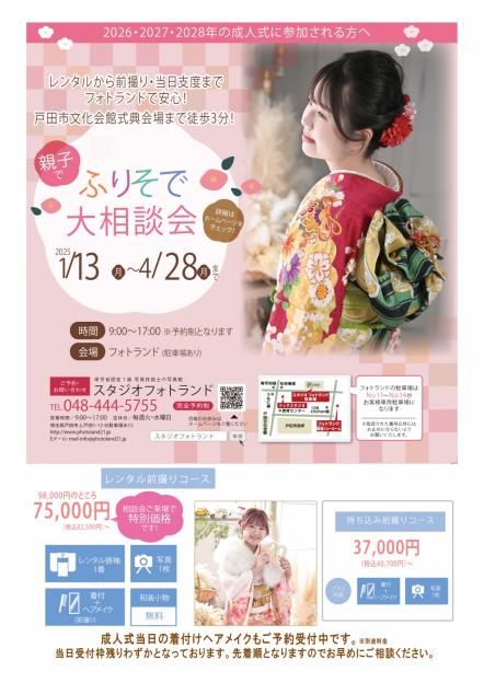 季節の行事 七五三 成人式 入学・卒業 桃・端午の節句 卒業袴 キッズ ニューボーン お宮参り・百日記念 お誕生日 1/2成人式・十三祝い はだかんぼ 1歳記念 ファミリー マタニティ ウェディング ファミリー プレミアム(長寿) 結婚記念日 個人・法人 証明写真 プロフィール・宣材写真 法人向け撮影 その他 趣味・習い事 ペット撮影 遺影 お受験写真 マンスリーフォト 撮影オプション 季節のお写真 季節の写真 ① 季節の写真 ② 七五三 ① 七五三 ② 七五三 ③ 成人式 ① 成人式 ② 成人式 ③ 入学式・卒業式 桃・端午の節句 卒業袴 ベイビー ニューボーン ① ニューボーン ② お宮参り 百日記念 ハーフバースデー 1歳記念 マンスリーフォト ① マンスリーフォト ② キッズ お誕生日 1/2成人式・十三祝い マタニティウエディング マタニティ ① マタニティ ② マタニティペイント ウェディング ① ウェディング ② ファミリー ファミリー プレミアム(長寿) 結婚記念日 個人・法人 証明写真 プロフィール 宣材写真 法人向け撮影 その他 趣味・習い事 ① 趣味・習い事 ② ペット撮影 遺影 お受験写真 WEB予約 イベントのお知らせ イベントのお知らせについて 端午の節句撮影会 桃の節句撮影会 はだかんぼ撮影会 バースデーキャンペーン 紹介キャンペーン 桃の節句撮影会桃の節句・端午の節句撮影会 データ3カットorキャビネ台紙1面 3,300円 土日祝+3,520円 家族撮影+3,520円 きょうだい撮影無料 ※他のキャンペーンとの併用はできません。 【ご来店特典】 衣装・おひなさま・兜レンタル0円 平日ご来店で データ1カットorキーホルダー プレゼント 詳細はこちら➡桃・端午の節句 WEB予約【桃の節句・端午の節句】からご予約ください。 LINEやお電話からも受付しております。 はだかんぼ撮影会はだかんぼ撮影会 参加費4,400円(5カットデータ付き) ・全データ+13,200円 ・メモリアルプラン(見開き台紙7カット・全データ付き)+16,500円 【予約方法】 WEB予約【はだかんぼ撮影会】からご予約ください。 LINEやお電話からも受付しております。 詳細ははだかんぼ撮影会にてご案内していますので 必ずチェックをお願いします。 バースデーキャンペーンバースディキャンペーン 六切りプリントorデータ3カット 4,400円 土日祝+3,520円 家族撮影+3,520円 きょうだい撮影無料 ※他のキャンペーンとの併用はできません。 ハーフバースディ➡ハーフバースディ 1歳誕生日➡1才誕生日記念 2才以上➡キッズフォト 紹介キャンペーン≪フォトランドお友達紹介特典≫ 紹介して頂いた方・紹介された方両方に Amazonギフトカードをプレゼント! ◎紹介されたお友達(初めてのご来店) Amazonギフトカード1,000円分 撮影後、商品と一緒にお渡しします。 ◎ご紹介者様 Amazonギフトカード2,000円分 お友達が撮影後にお渡しします。 ~ご利用の流れ~ ①LINEまたはお電話でお問合せください。 紹介カードをお送りします。 ②紹介カードにお名前をご記入の上、お友達にお渡しください。 (写真で送っても可 紹介者様のお名前はフォトランドにご登録頂いているお名前をご記入ください。 ③ご来店されたお友達は紹介カードを撮影時にスタッフにご提示ください。 【ご紹介者様について】 フォトランドを一度でもご利用された方であれば対象です。 複数のお友達をご紹介いただいた場合、人数分特典プレゼントいたします。 【ご紹介されたお友達について】 ・紹介された方は『初めて』が対象です。 ・初めてであればご親族でもお友達対象となります。 ・既に予約済みの際は対象外となります。 ・特典ご利用の為のキャンセル・変更は不可となります。 ・複数名に紹介された場合でも特典は一回分になります。 ・有効期限内の撮影が対象です。 【その他注意事項】 ・フォトギフト券との併用は不可です。 (その他一部クーポンと併用不可の場合もございます) ・イベント撮影(ハロウィン・クリスマス会など)でのご利用は不可となります。 ・紹介カードをご提示していただいた場合のみ特典が発生します。 口頭での紹介などは対象外となりますのでご注意ください。 ・予告なく内容の変更などが発生する場合がございます。ご了承ください。 キャンペーン主催:スタジオフォトランド お問い合わせは【スタジオフォトランド】【0484445755】までお願いいたします。 Amazon、Amazon.co.jpおよびそれらのロゴはAmazon.com, Inc. またはその関連会社の商標です。