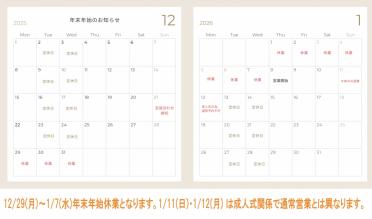 1月11日・12日は成人式の関係で通常営業とは異なります。